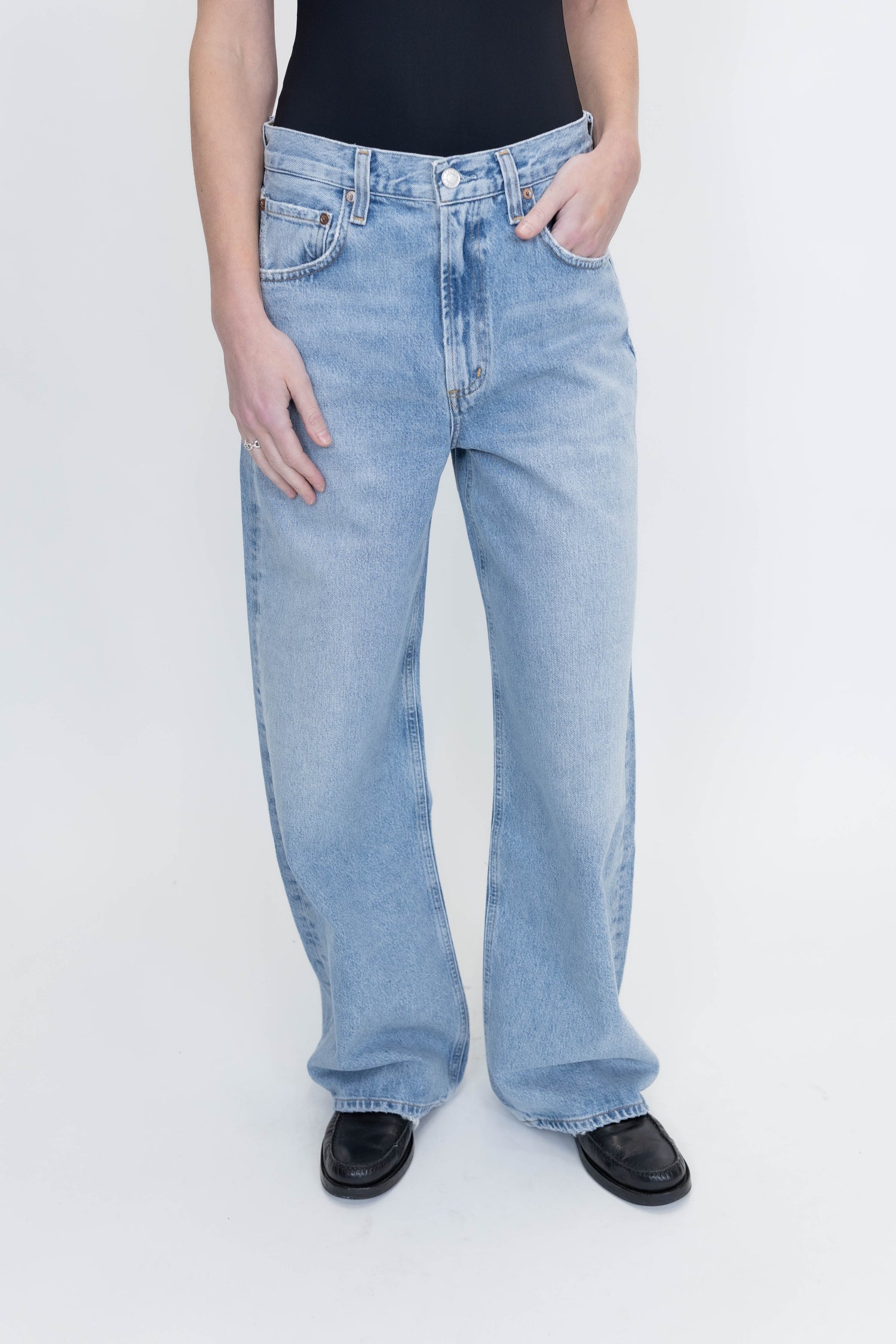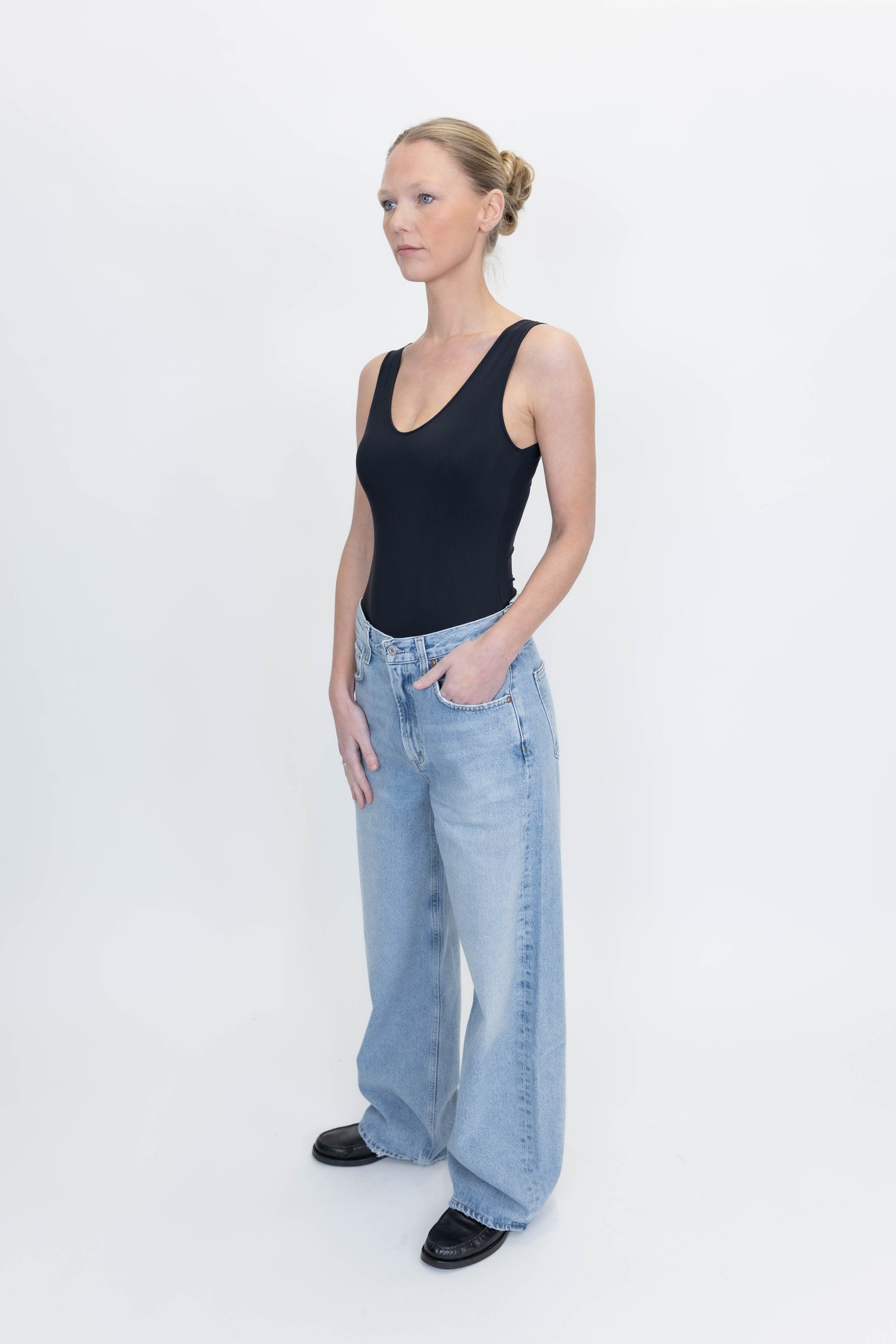 An updated twist on the barrel leg trend. This fit offers a comfortable and easy top block with a mid-rise waist. The sleek, low curved out seam gently tapers down to the ankle for a subtle yet sophisticated look.