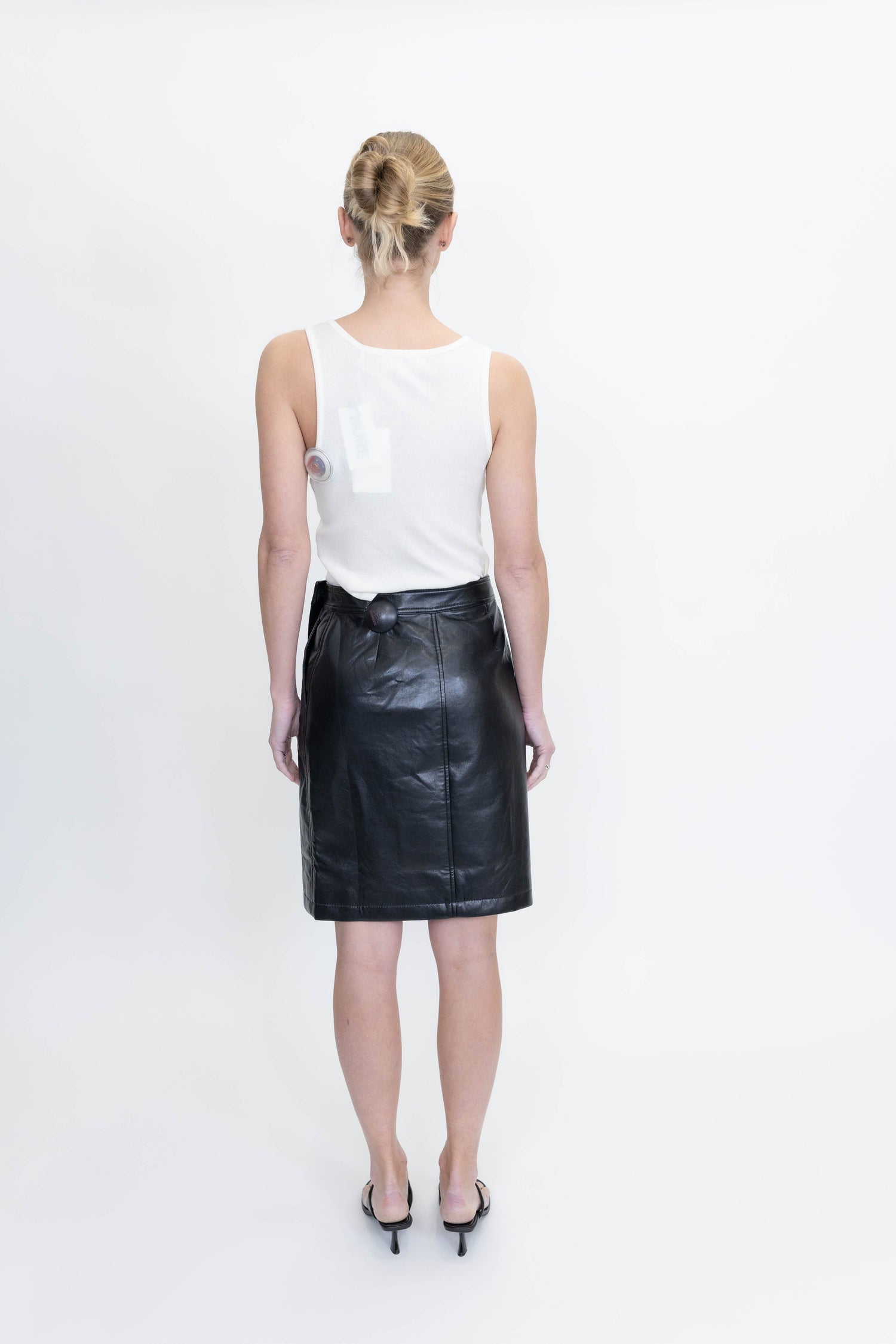 A sleek midi skirt cut from recycled leather, featuring a subtly asymmetrical design for a modern edge.