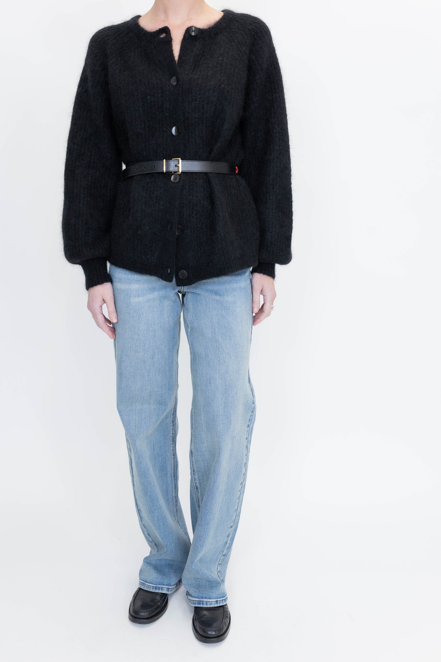 These jeans run large. We recommend sizing down one size. Wide leg jeans feature a straight, flowing silhouette with a high-rise waist and classic five-pocket design. Textured denim finish and secure button closure emphasize timeless style with a modern edge.