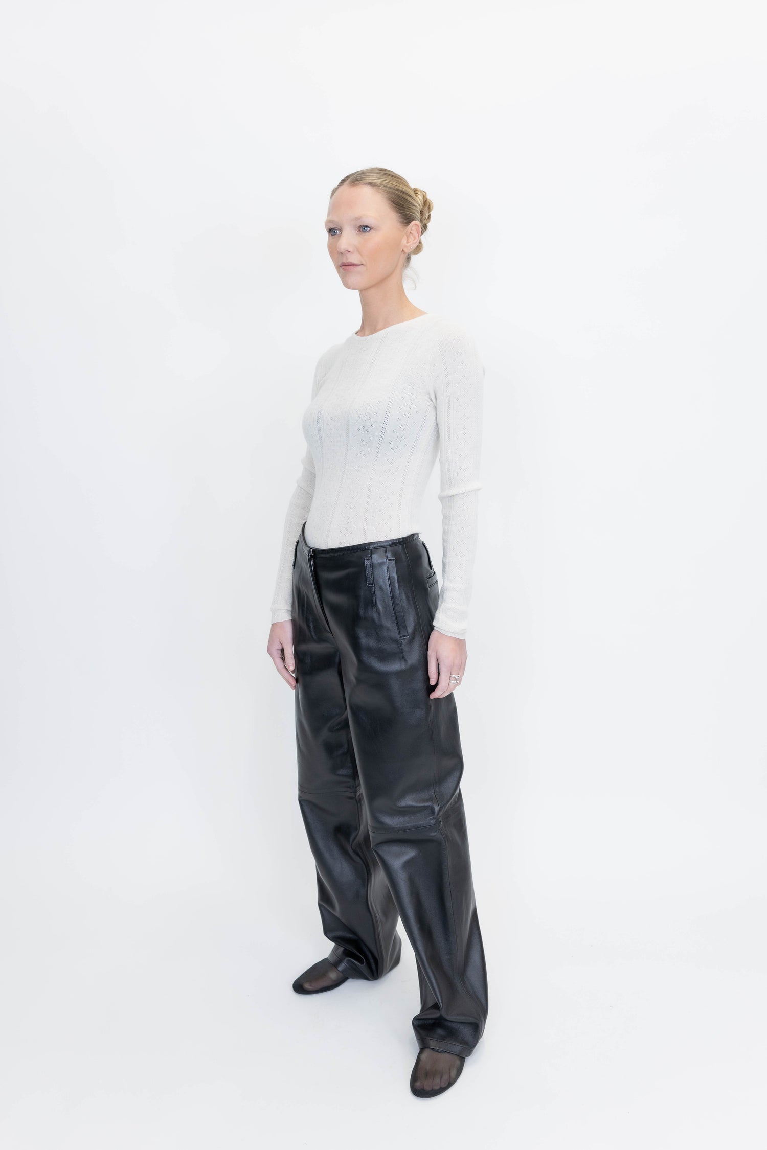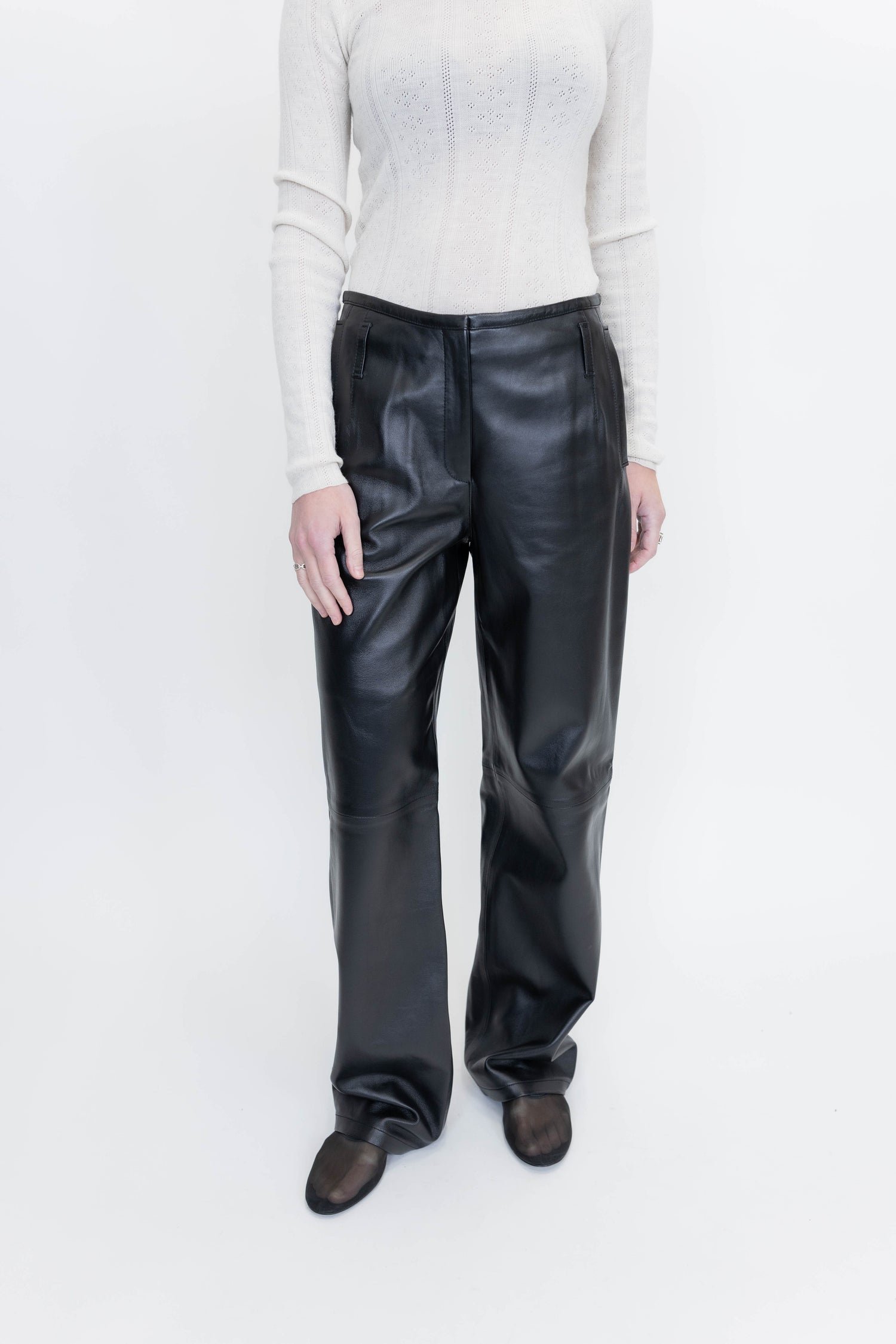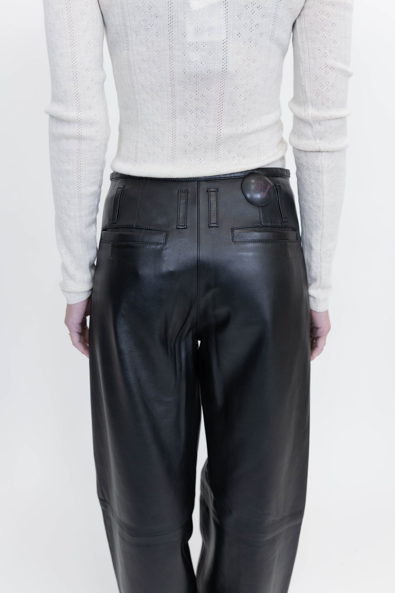 CARACAS leather pants. Low-rise with a wide and flowing cut. Partially lined for comfort and featuring a slanted belt detail.