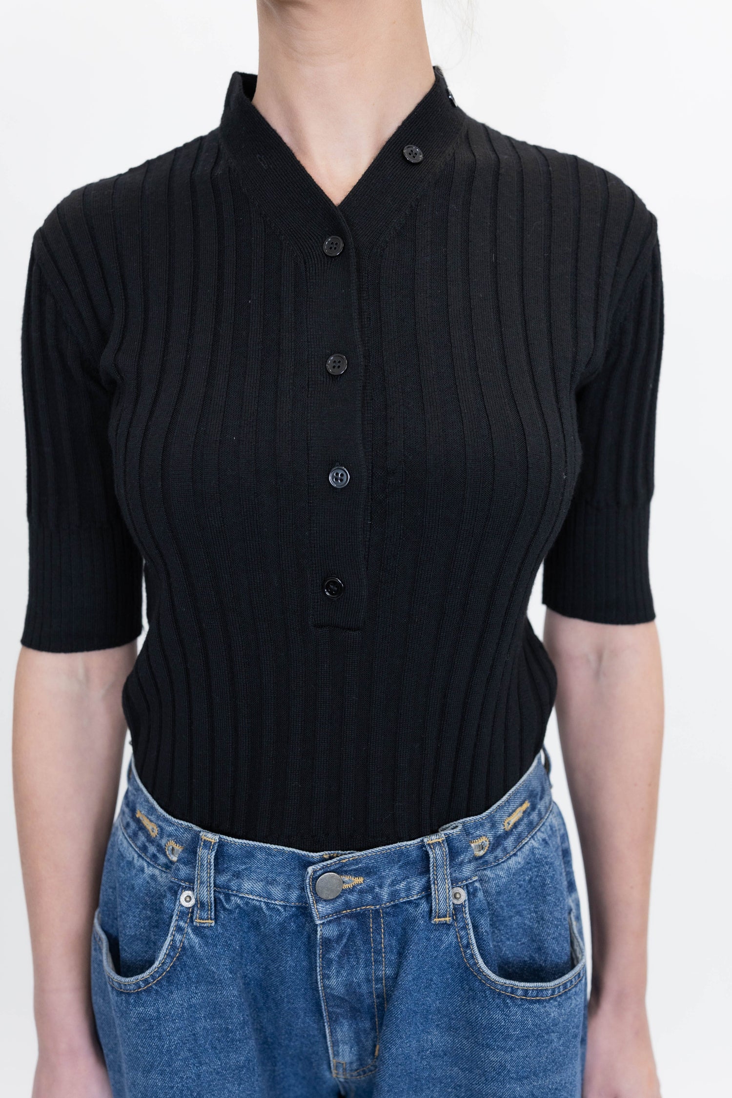 LUNEA knit sweater with 3/4 sleeves. Fitted cut and regular length. Continuous button placket on the collar and ribbing throughout the sweater.