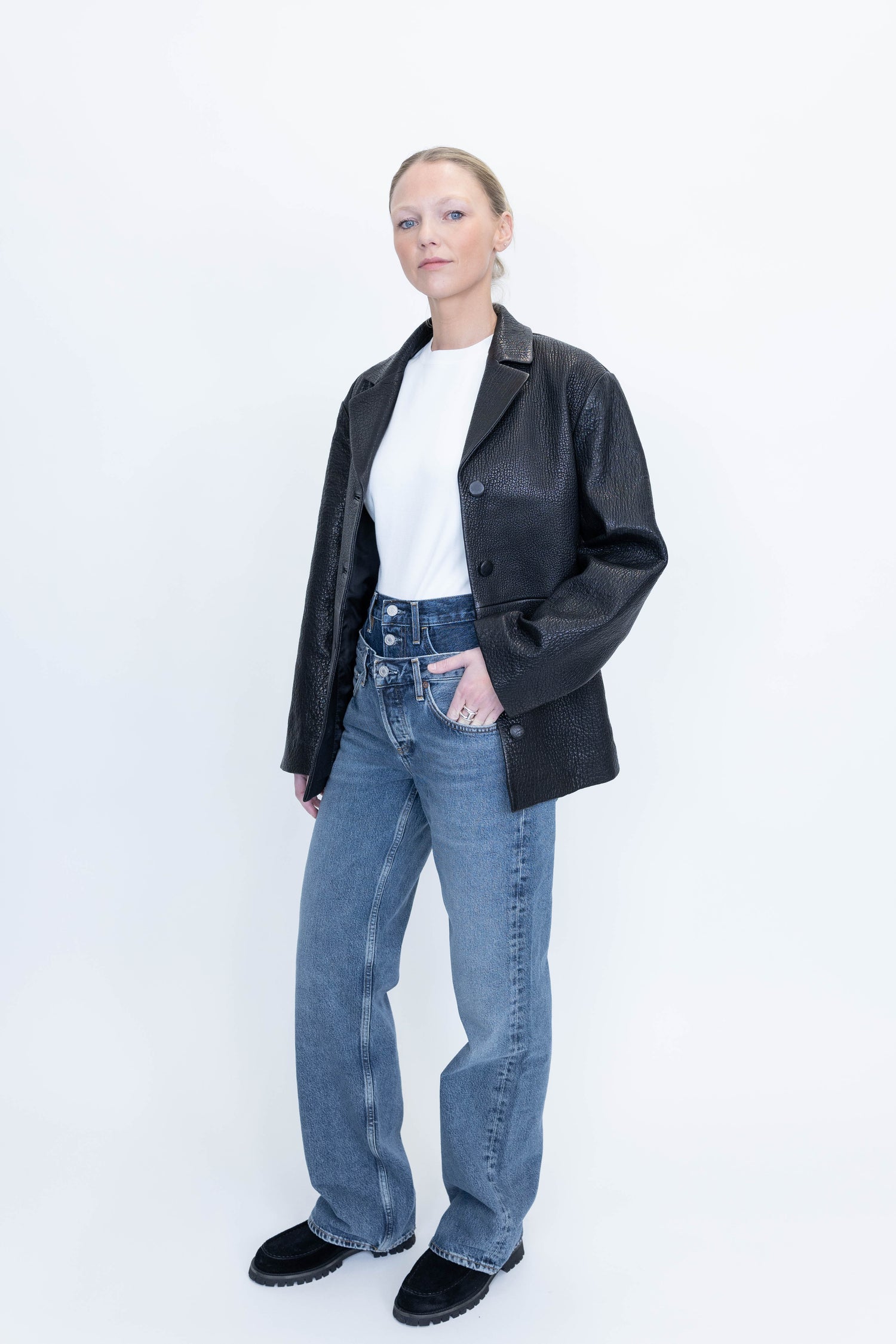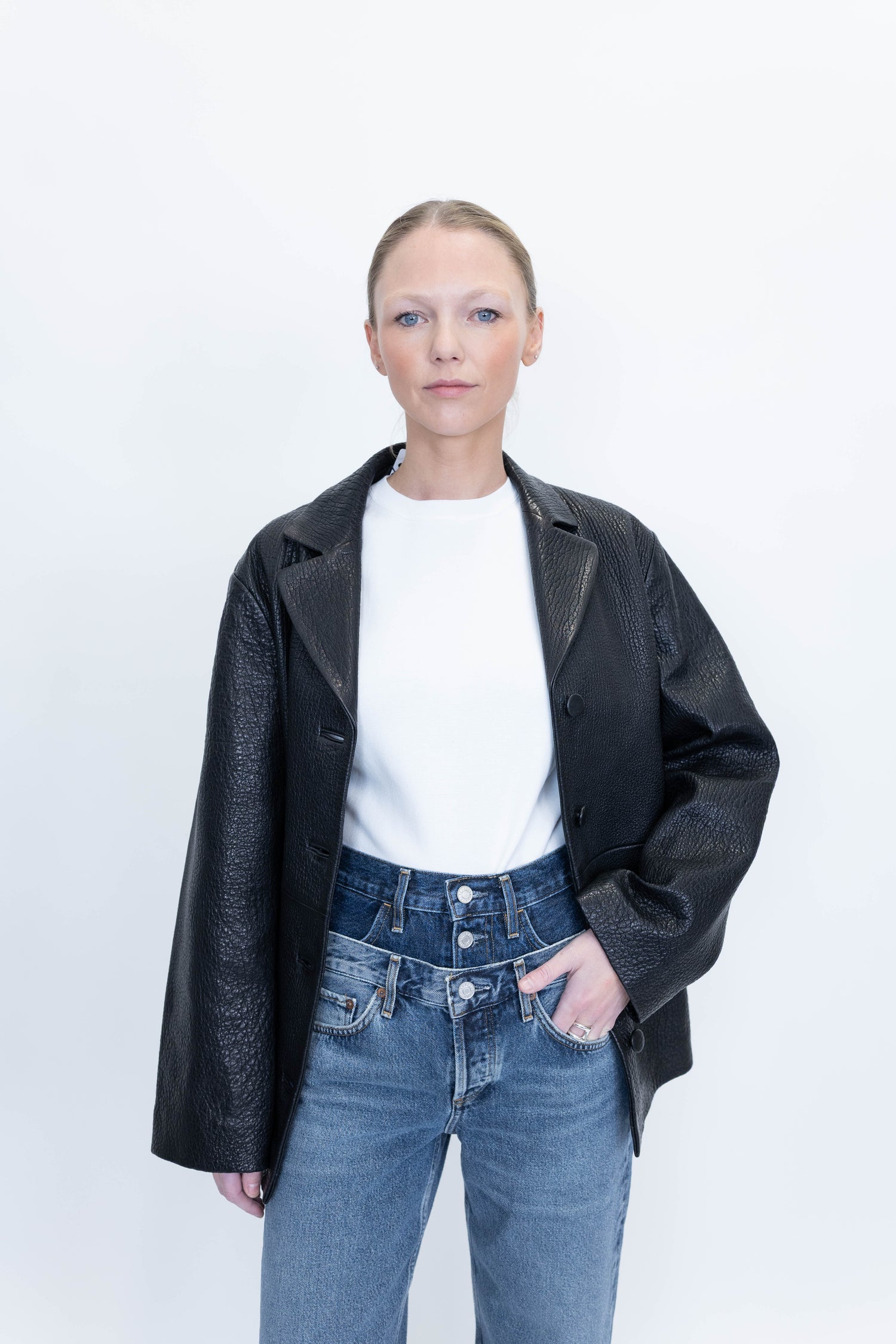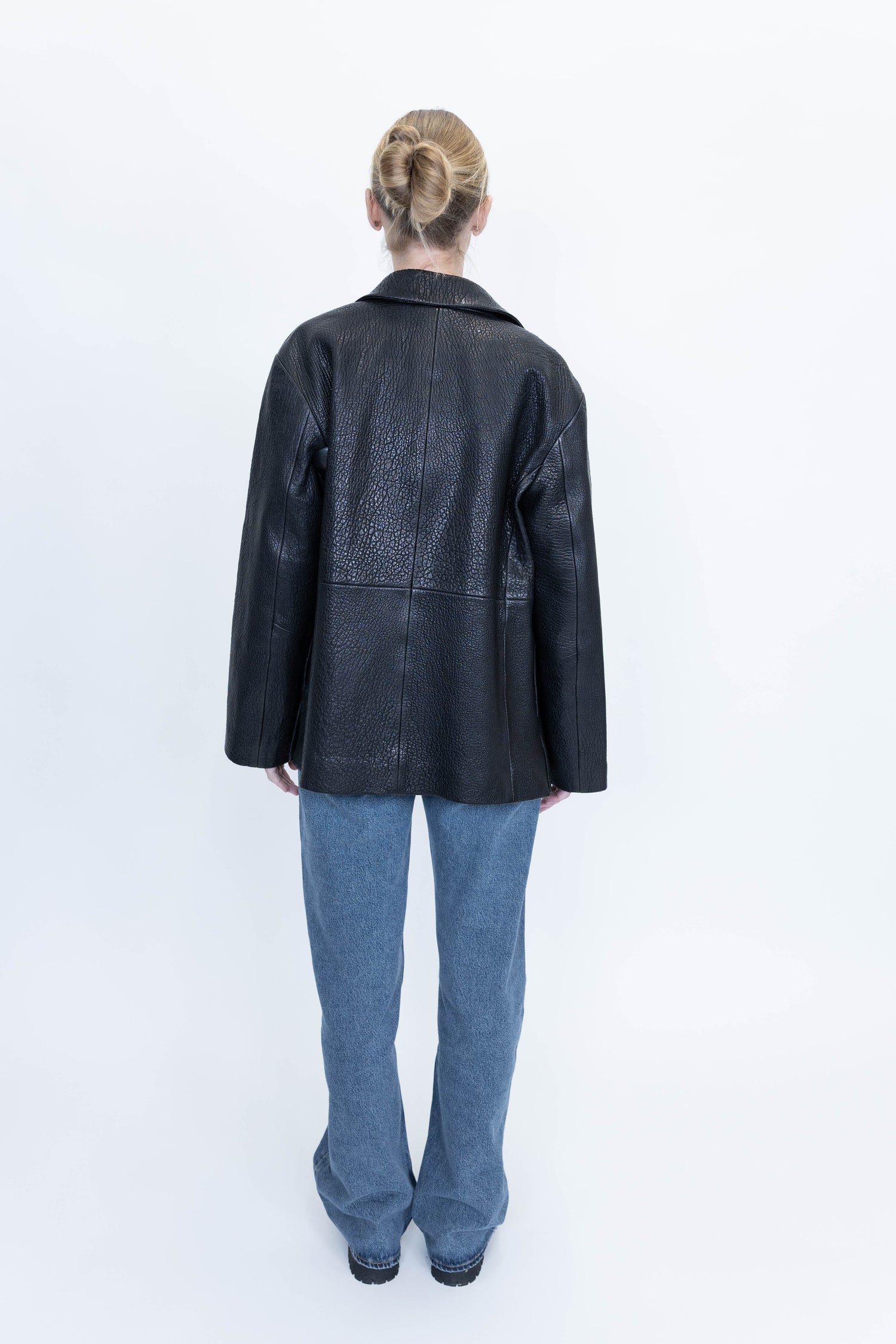A structured jacket with a subtly boxy silhouette, crafted from rich, heavy-grain leather. Fully lined and single-breasted, it features leather button closures, side-seam pockets, and small side splits for ease of movement.