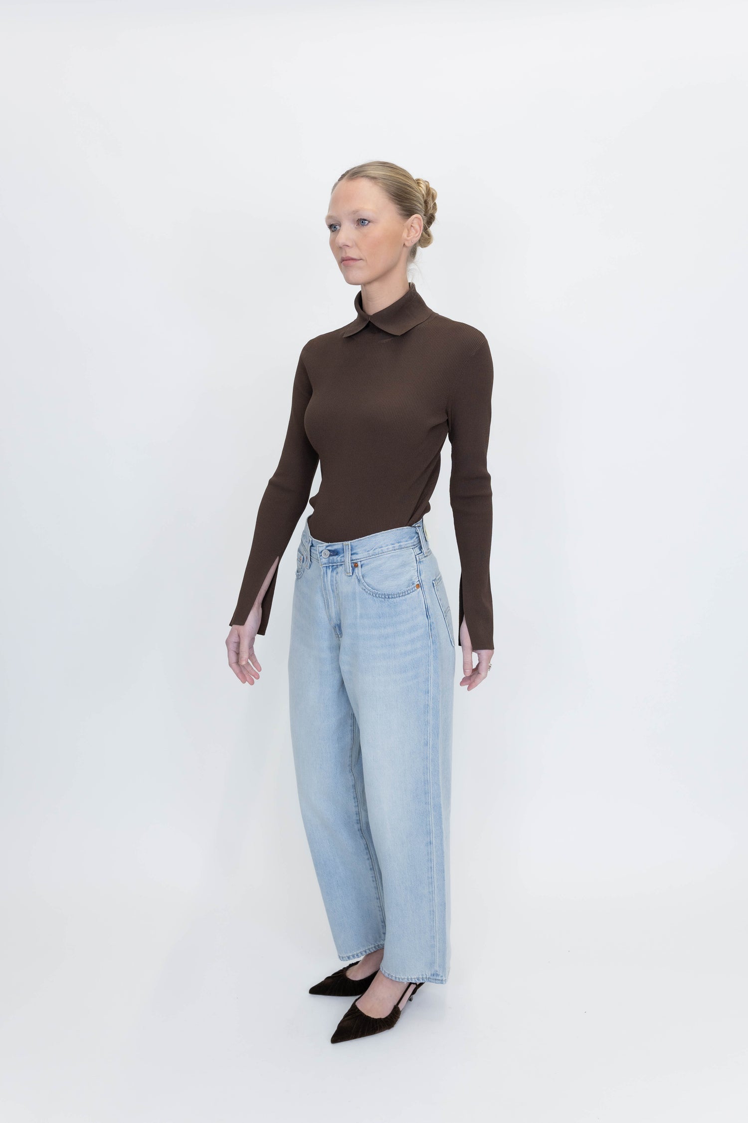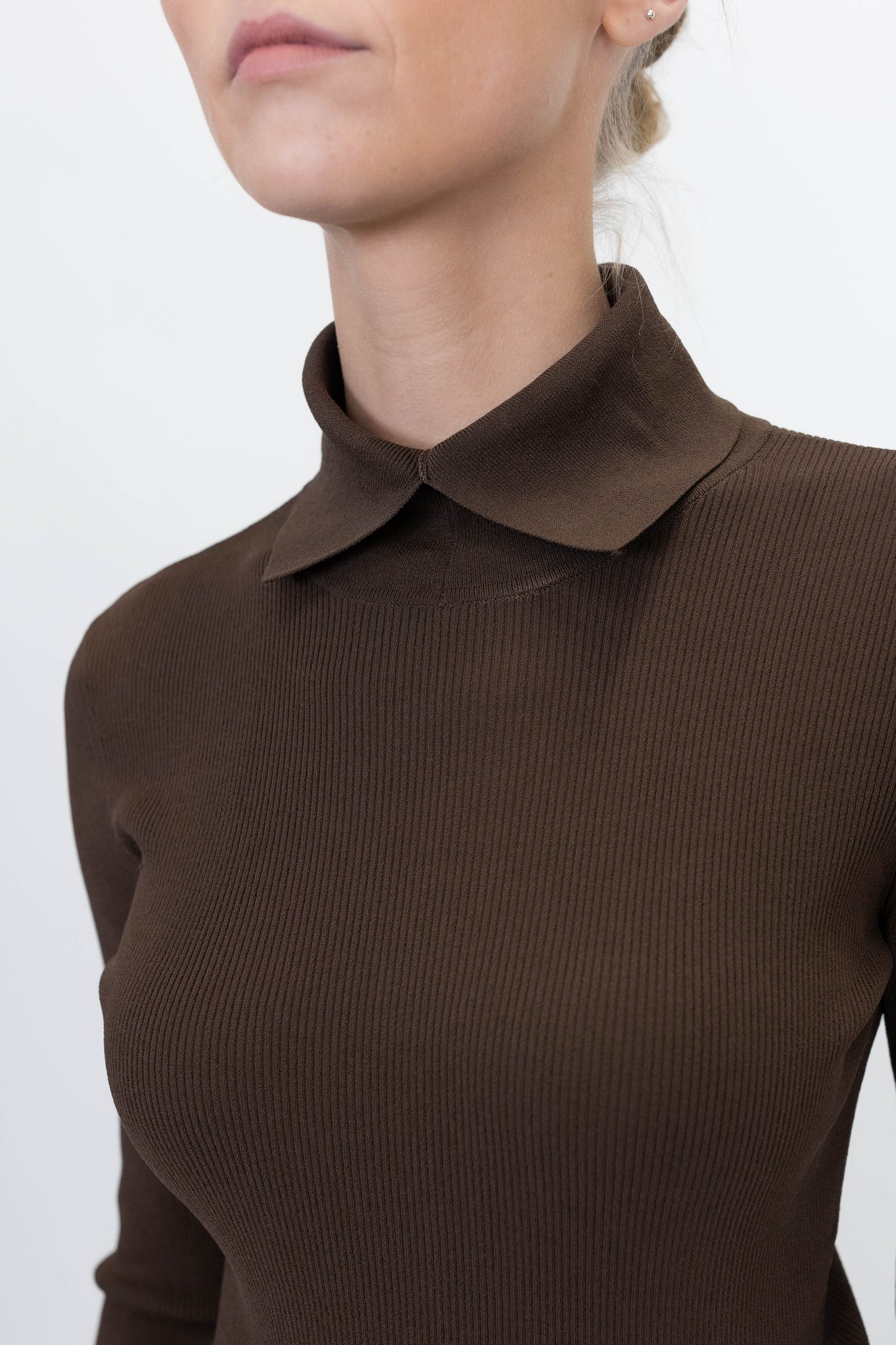 The Madison Neck Knit is a ribbed blouse featuring a high neck collar for a chic and cozy look. Perfect for layering or wearing on its own, it blends comfort with refined style.